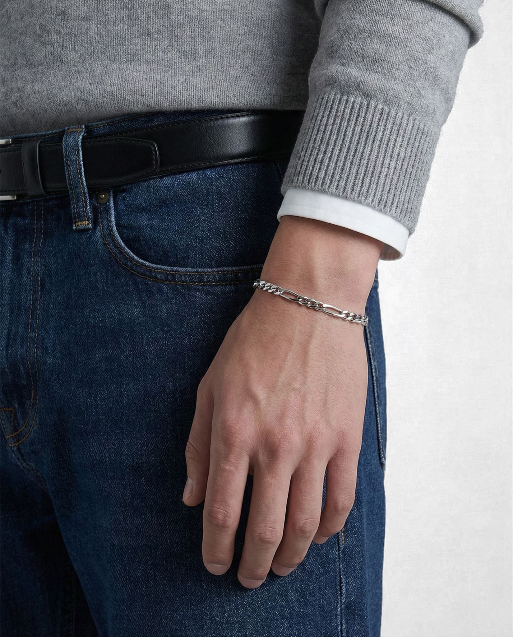 This sleek, silver figaro bracelet will make a unique fashion statement. Made with a polished silver chain, this bracelet is perfect for everyday wear. Its simple yet stylish design will give any outfit a timeless look.