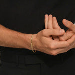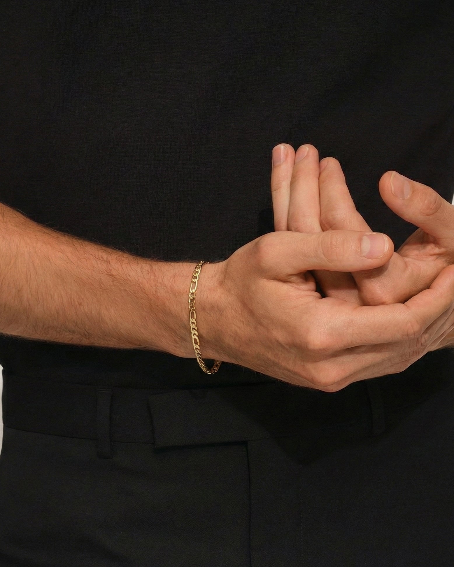This sleek, silver figaro bracelet will make a unique fashion statement. Made with a polished 14k gold chain, this bracelet is perfect for everyday wear. Its simple yet stylish design will give any outfit a timeless look.