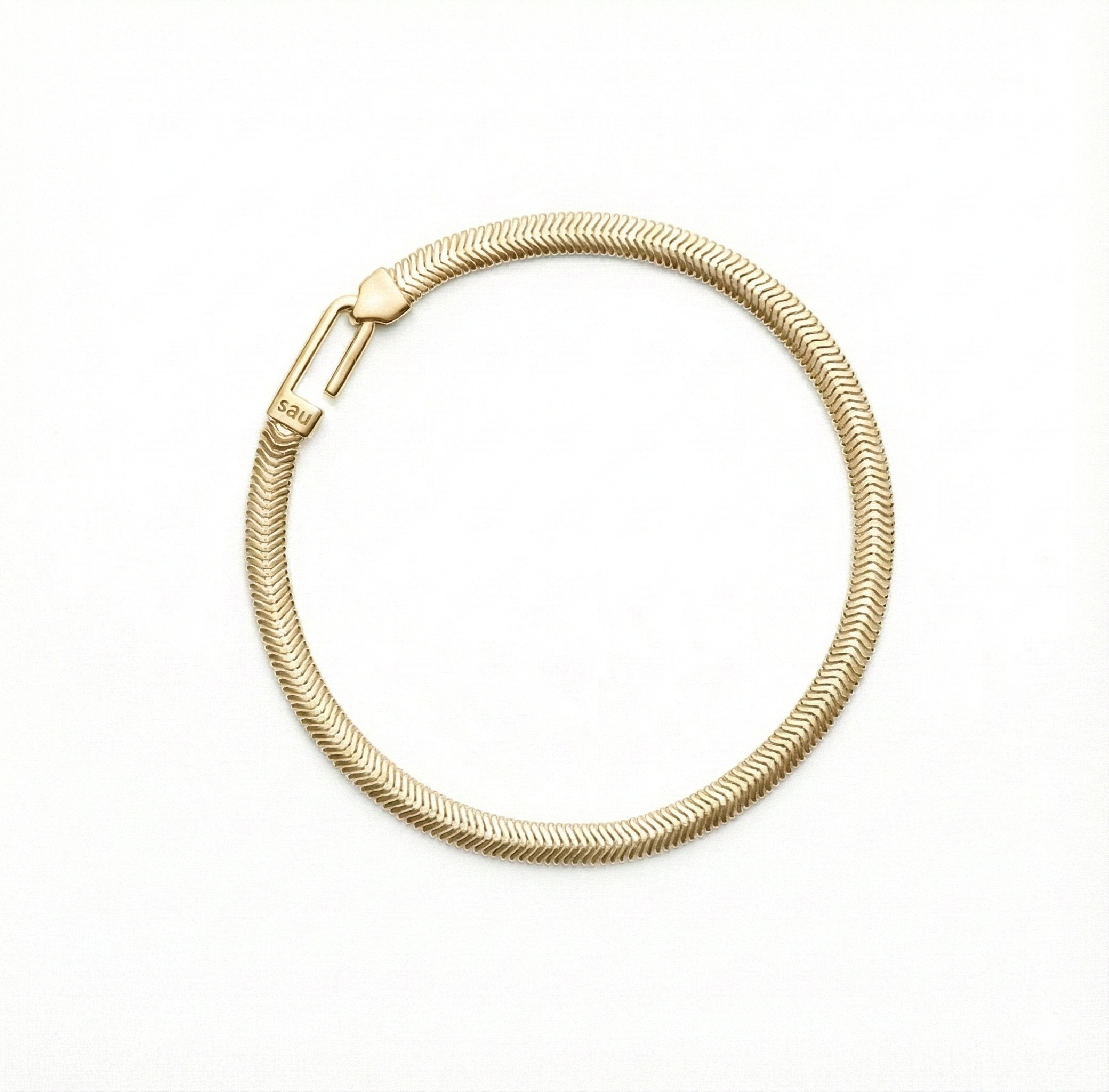 A sleek flat bracelet with a fish-back design that catches light beautifully. Its silver finish and minimalist aesthetic make it versatile enough for everyday wear or layering. Clean lines and understated elegance in one simple piece.