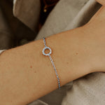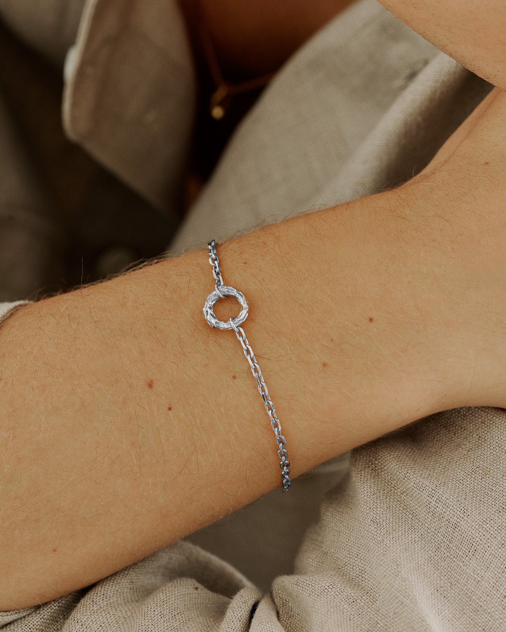 Crafted in sterling silver with a lightly hammered finish, this bracelet blends raw texture with refined structure.