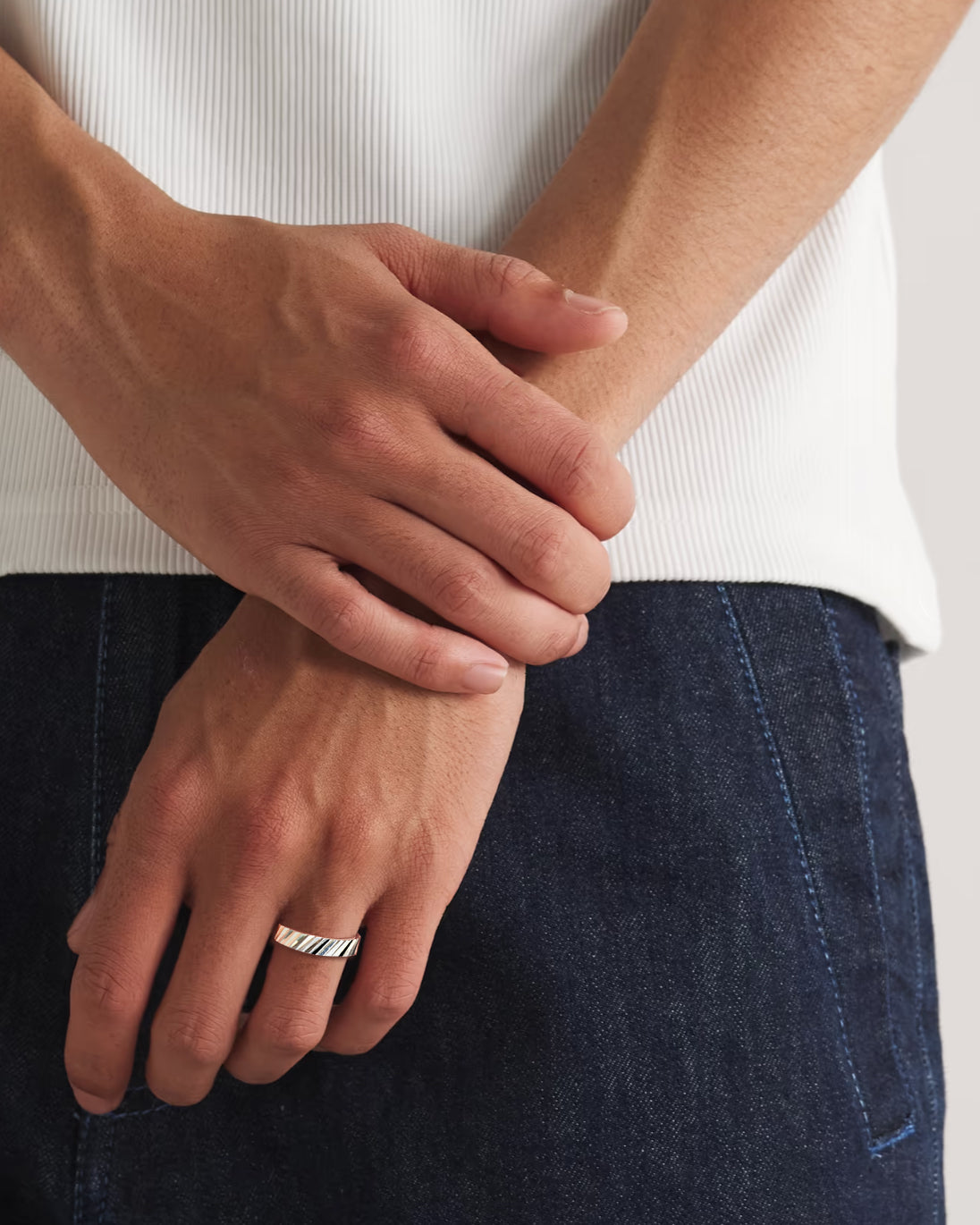 The Edge Ring is cast in solid sterling silver. This thin, elegant piece adds minimal, contemporary style, perfect for any look.