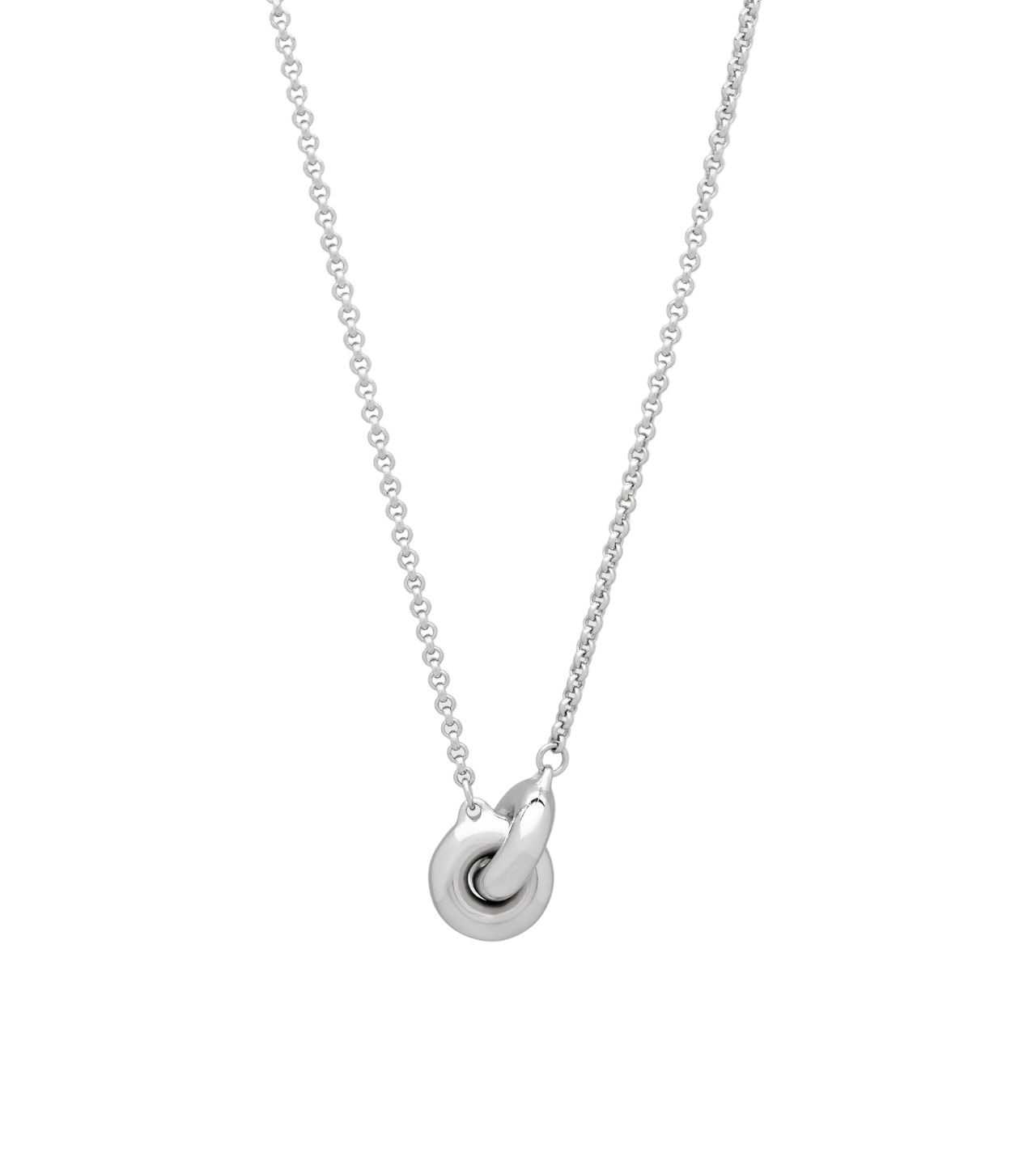 Crafted in silver, a singular cylindrical form rests with precision over its counterpart — secured by a force chain. Minimal in structure. Architectural in spirit.