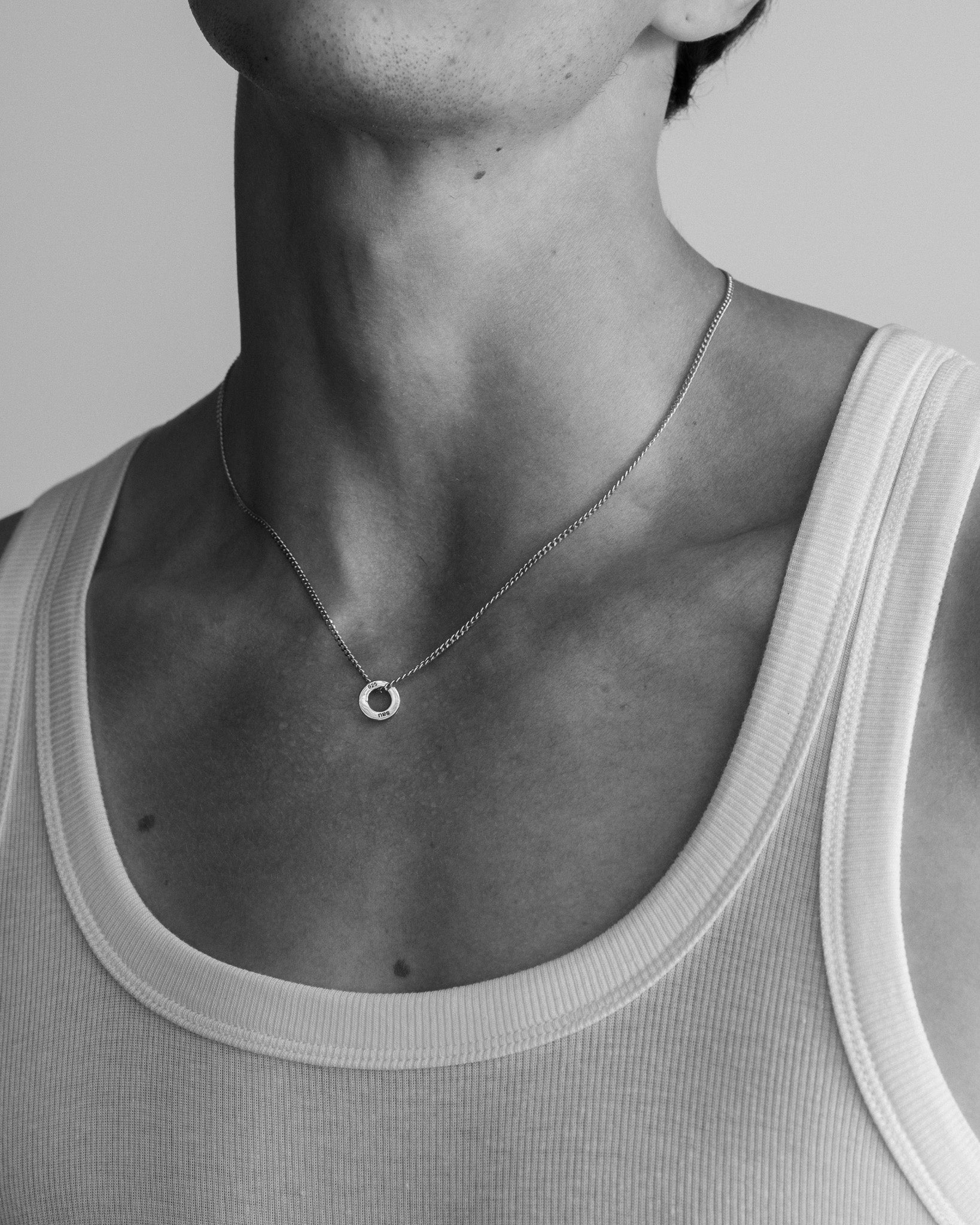 Precise forms and precious metals converge. The small track necklace in polished sterling silver.