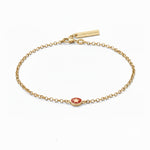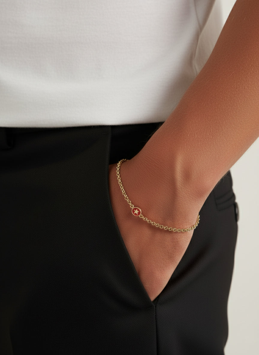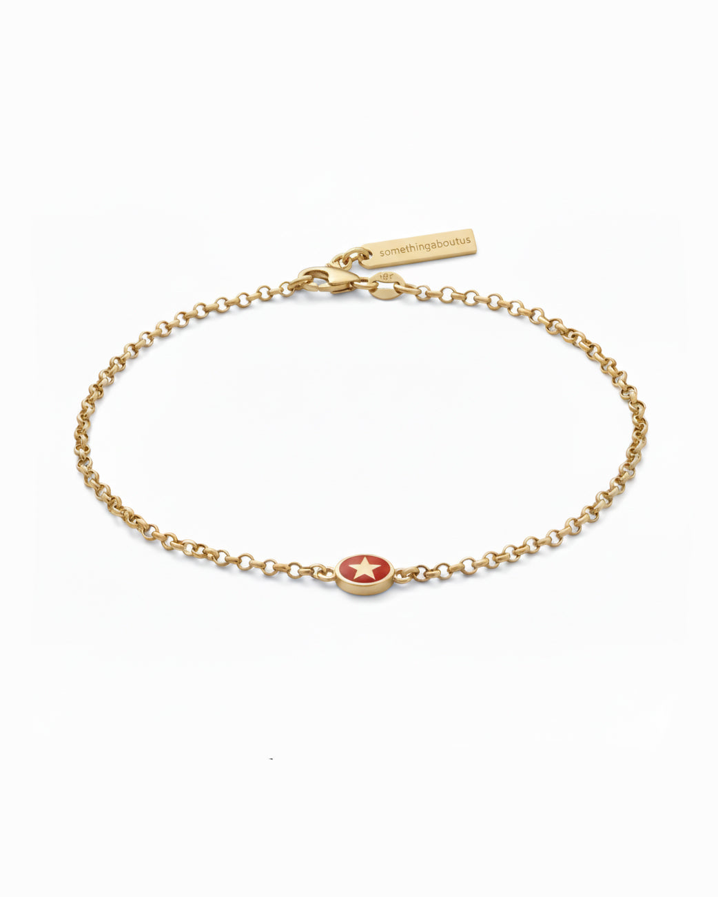 A minimalist gold-toned bracelet featuring a red enamel center with a star detail. The fine chain adds a sleek, modern touch, while the star element brings subtle character to the design. With its polished finish and understated form, it’s a unisex piece made for everyday wear.